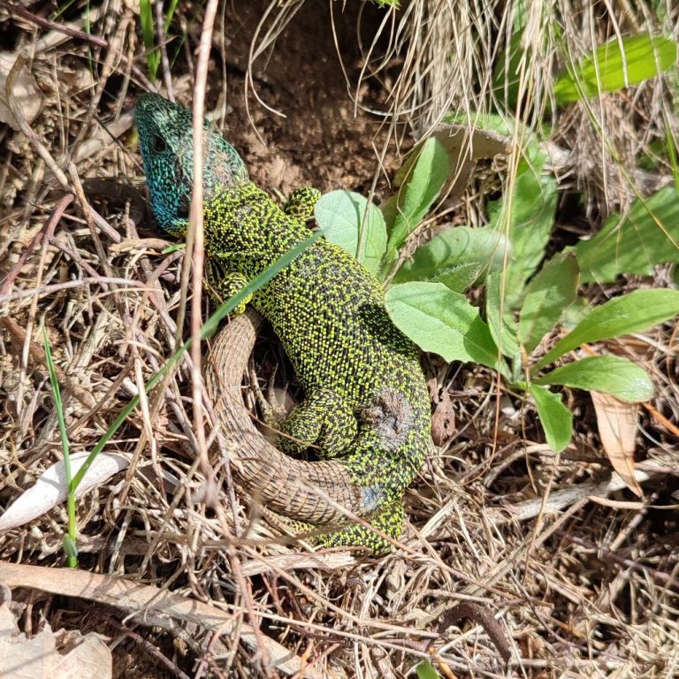Este lagarto con fermosas cores azuis na cabeza é unha especie endémica da Península Ibérica. Como a todos os lagartos encántalle tomar o sol nas pedras, polo que o seu período de actividade é durante o día. Habita bosques húmidos, con carballos, bidueiros ou salgueiros, e debido a que este tipo de bosques son cada vez mais reducidos, o seu estado de conservación é de case ameazado.