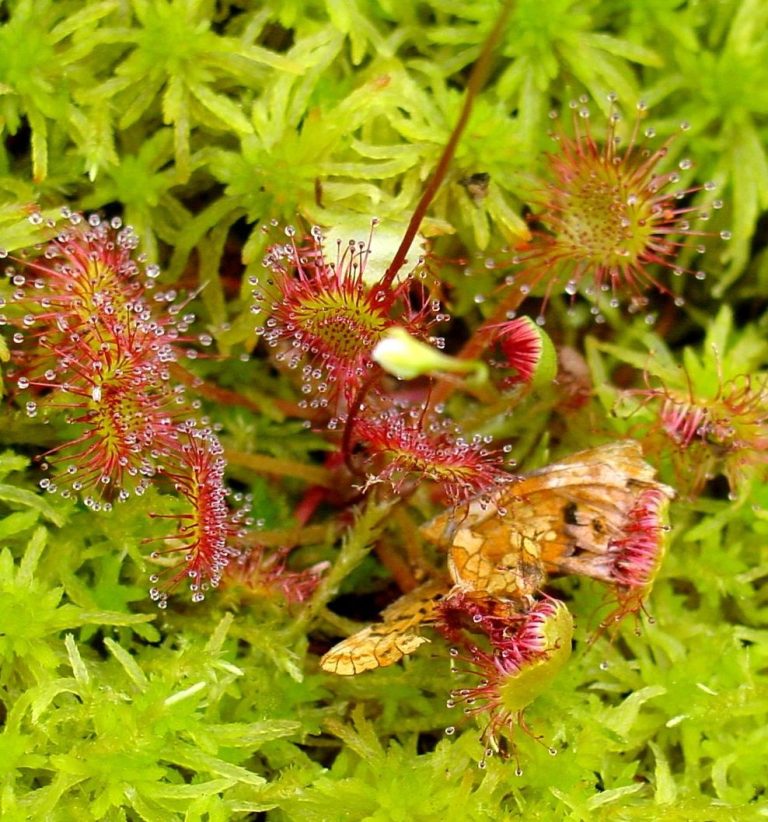 Drosera rotundifolia cos restos dunha bolboreta