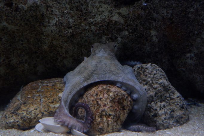 Comentario ás fotos do polvo: Este tentacular amigo achábase moi tranquilo sobre a súa rocha. Descoñecemos que fixemos para enfadalo pero… montou en cólera! Como se pode apreciar na transición dunha imaxe á outra, inflou a cabeza, ergueu os tentáculos e desenvolveu manchas laranxas pola pel. Quedounos moi clara a mensaxe: Queredes pelexa?