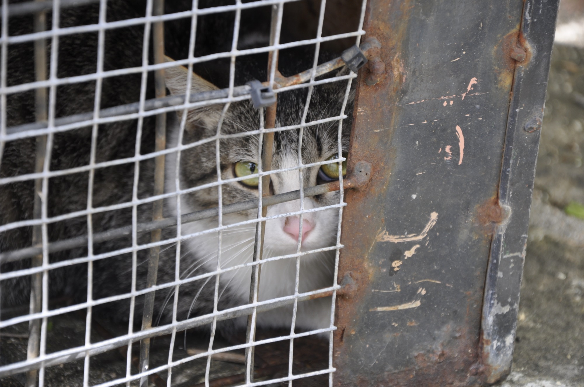 Comentarios ás fotos de Dula: Atopamos esta gata nunha gaiola non homologada e despois de estar atrapada durante o que sospeitamos foron tres días. A primeira fotografía amósaa aprisionada. A segunda no momento da súa fuxida ao abrir a gaiola e a derradeira vez que mirou atrás.
